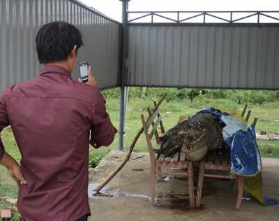 Người dân hiếu kỳ chụp hình xác cá sấu Xiêm