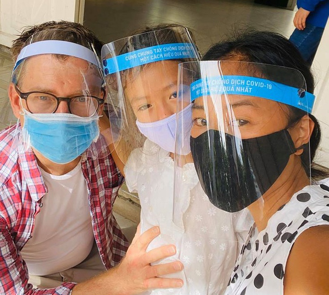 Ca sĩ Đoan Trang cùng cồng và con gái đi xét nghiệm Covid. (Ảnh: NVCC)