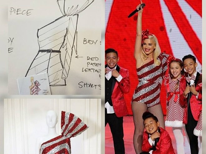 Bộ trang phục nữ ca sĩ diện trong tiết mục You make it feel like christmas được thiết kế bằng chất liệu vải sequin lấp lánh, hòa quyện giữa gam màu đỏ và trắng nổi bật. Kiểu dáng vai lệch với chi tiết thắt nơ đính kết giúp Gwen Stefani nổi bật trên sân khấu âm nhạc.
