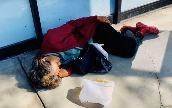 Hình ảnh ca sĩ Kim Ngân ngủ thiếp ở vệ đường do khán giả chụp lại.