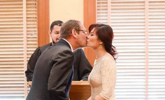 Ngọc Anh và ông xã Tây hôn nhau trong buổi lễ tại tòa. (Ảnh: FBNV)