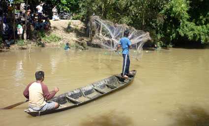 | Người dân xã Tân Kiều dùng lưới tìm bắt cá lạ ngày 13/8 nhưng không có kết quả |