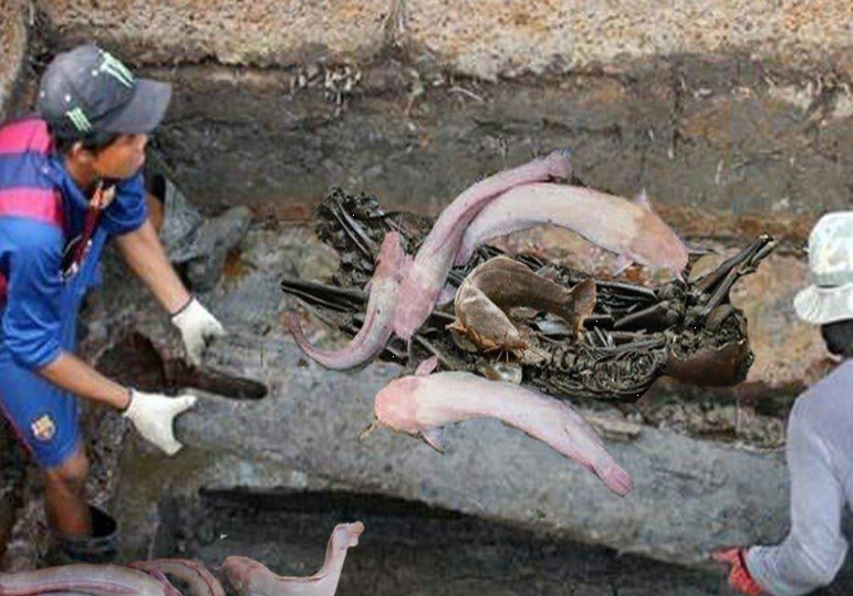 Ai đó bỗng hét lớn: “Hình như có thứ gì động đậy bên dưới”. Máy móc liền được cho dừng hoạt động. Hóa ra, bên dưới hố trôi ra chục con cá trê còn sống. Mọi người cảm thấy rất kinh ngạc, không hiểu chúng sống trong mộ cổ bao lâu rồi.