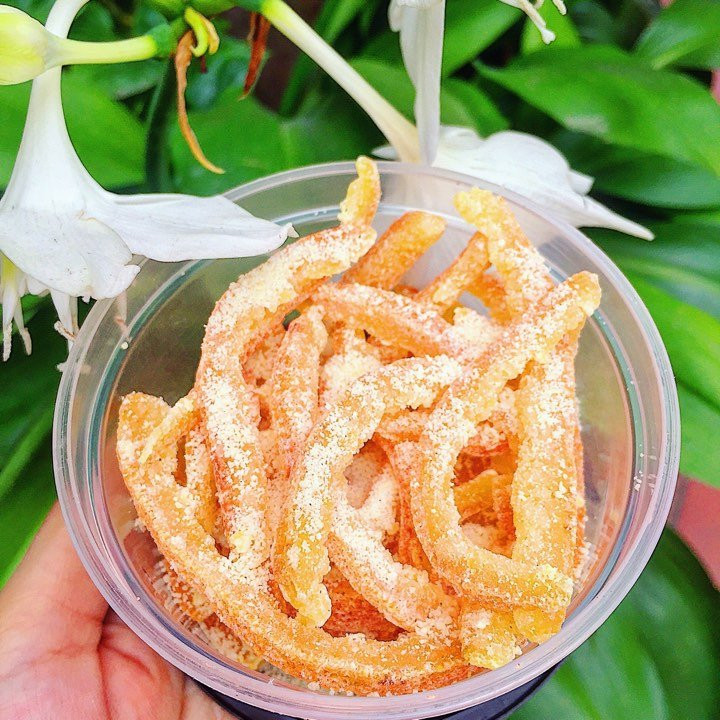 - Khi vỏ cam đã ráo nước thì tiến hành ướp đường theo tỉ lệ 1kg vỏ cam ướp 700g đường và để qua đêm cho ngấm.