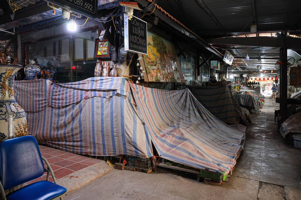 Hình ảnh bên trong của khu chợ gốm ngày 4/6, nhiều cửa hàng đã đồng loạt phủ bạt, giăng lưới khóa cửa. Được biết, những quầy hàng này đóng cửa 4,5 ngày nay vì không có khách mua. Thời tiết nắng nóng nên nếu mở cửa sẽ tốn tiền điện, tiền thuê nhân viên càng khiến tiểu thương không mặn mà buôn bán.