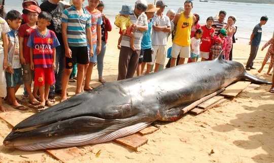Con cá voi xanh được phát hiện dạt vào bờ hồi sáng 11/12 (Ảnh: Thanh Hải)