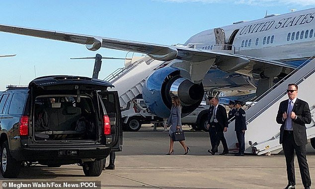 Đệ nhất phu nhân Mỹ rời chiếc máy bay gặp sự cố, tiến về chiếc SUV đang đợi sẵn. (Ảnh: Daily Mail)