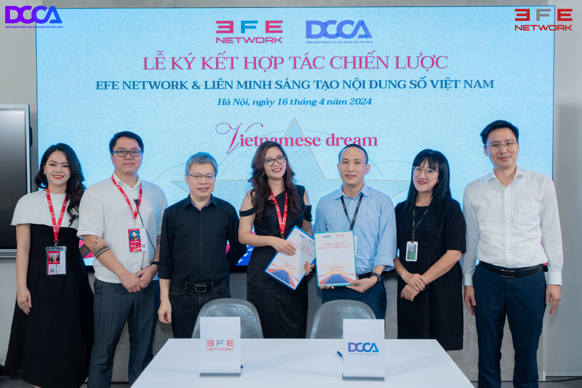 Ngày 16/04, Liên minh sáng tạo nội dung số Việt Nam - DCCA và EFE Network đã ký kết thỏa thuận hợp tác chiến lược trên nhiều phương diện nhằm khai thác thế mạnh mỗi bên trong việc xây dựng và củng cố ngành sáng tạo nội dung số phát triển bền vững, cũng như hỗ trợ các doanh nghiệp khai thác thương mại điện tử xuyên biên giới đạt hiệu quả.