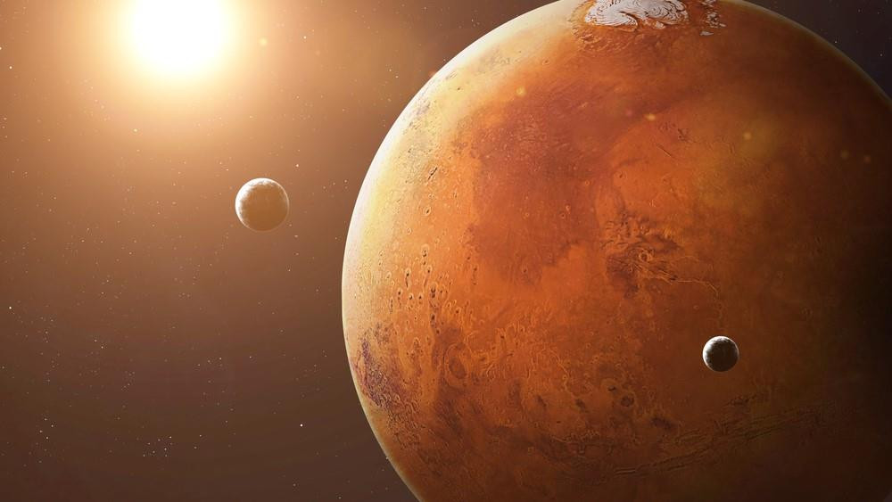 Ảnh dựng 3D cho thấy cảnh 2 Mặt trăng Phobos và Deimos đang quay xung quanh Sao Hỏa.