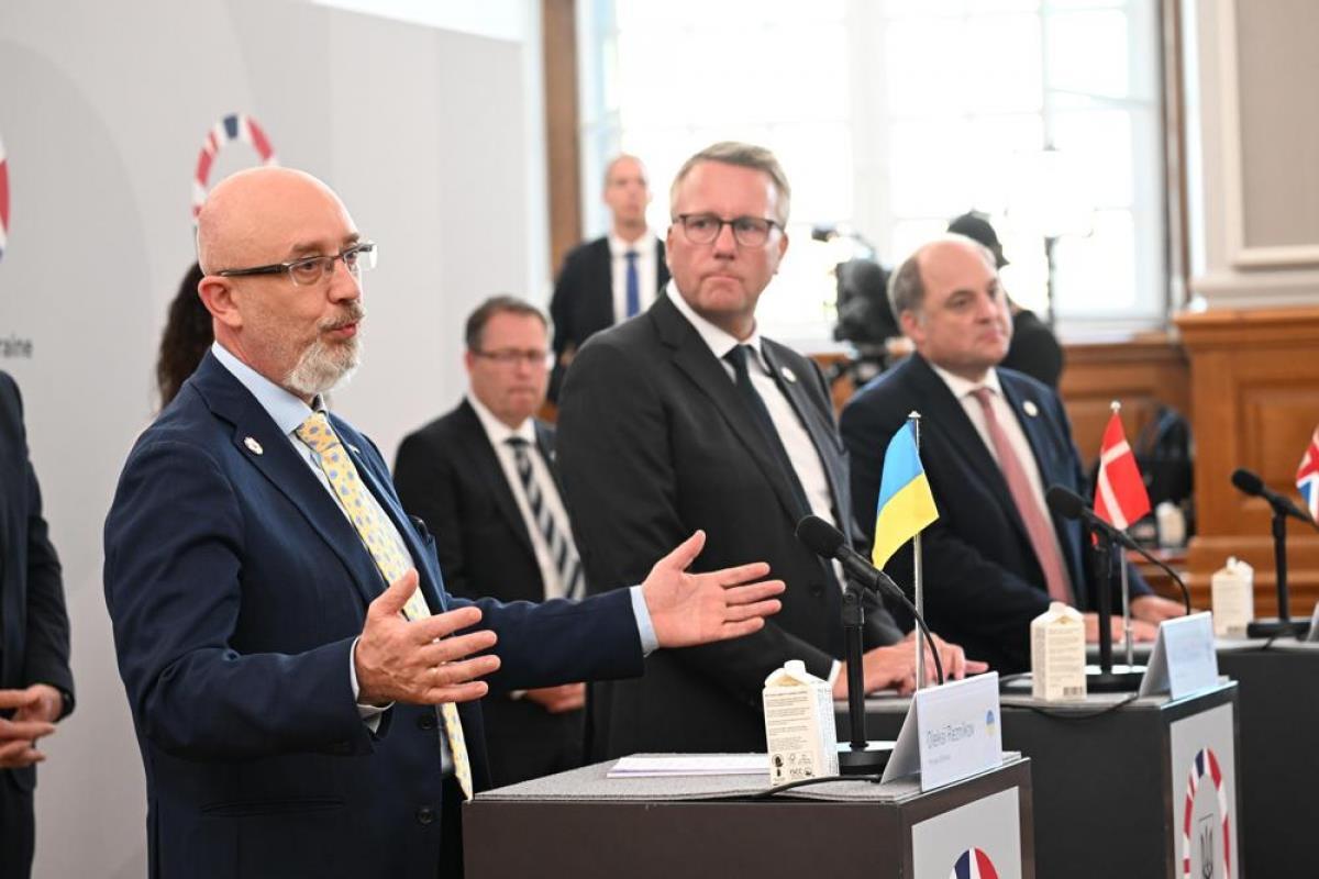 Bộ trưởng Quốc phòng Ukraine Oleksi Reznikov (ngoài cùng bên trái) phát biểu tại hội nghị ở Copenhagen ngày 11/8. Ảnh: AP