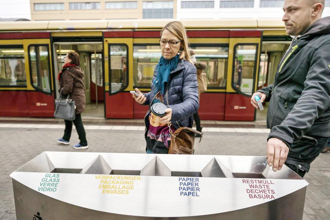 Thùng rác màu vàng đựng các loại chất dẻo như túi nilông, đồ hộp/lon rỗng, hộp đựng nước. Thùng đựng rác giấy màu xanh da trời, có thể vứt các loại báo cũ, tạp chí cũ, tờ rơi, sách cũ, bao bì bằng giấy, hoặc bìa cứng. Riêng thùng thủy tinh để vứt chai, lọ là thùng to tròn màu xanh lá cây với nhiều ngăn. Trong đó, chai, lọ thủy tinh bỏ vào một ngăn, còn các chai, lọ nhựa khác bỏ vào ngăn khác và không vứt các loại vỏ chai có thể tái sử dụng.