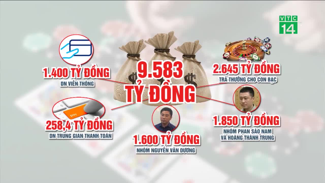 Với số tiền gần 9.600 tỷ đồng thu được từ các con bạc, cơ quan điều tra ước tính, doanh nghiệp viễn thông hưởng khoảng 1.400 tỷ đồng (tương đương 16% tổng giá trị thẻ viễn thông); doanh nghiệp trung gian thanh toán hưởng khoảng 258,4 tỷ đồng.