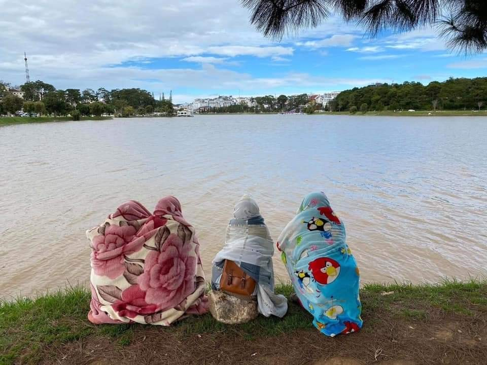 Cũng tếu táo về cái lạnh, nhóm bạn du lịch này chụp loạt ảnh trùm chăn khi tham quan Đà Lạt.