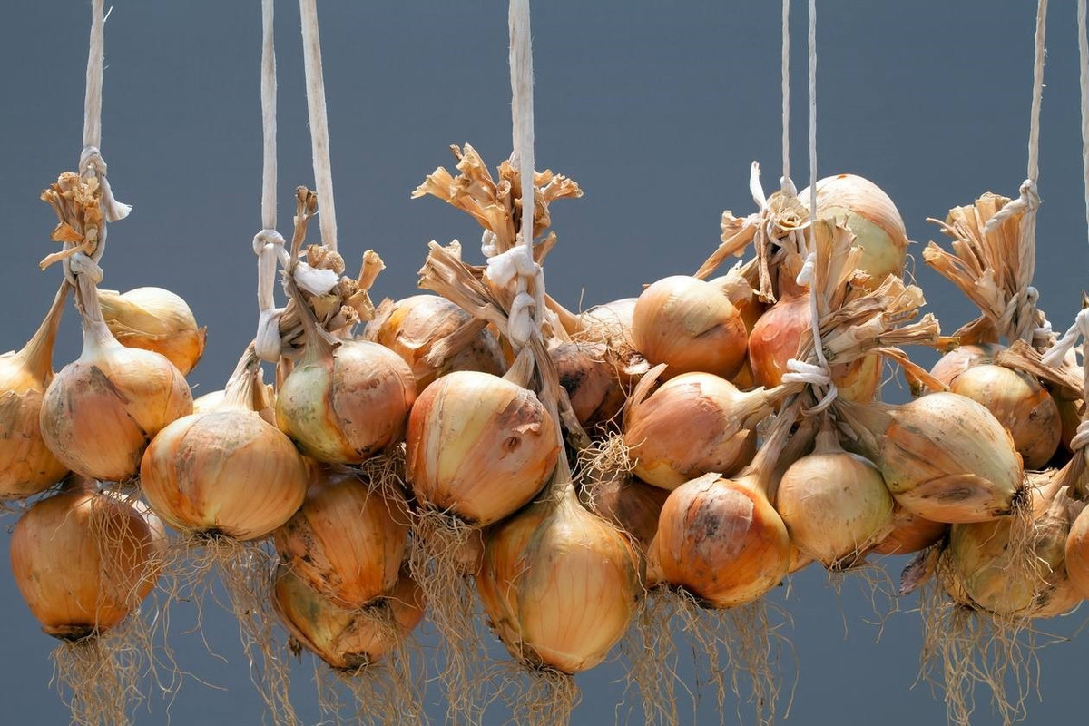 Cách bảo quản hành khô để lâu không mọc mầm: Treo ở nơi thoáng khí, tránh ánh sáng trực tiếp. (Ảnh: Pinterest)