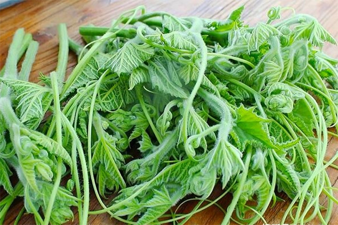 Đó là rau bí, tức phần ngọn và lá non của cây bí đỏ (bí ngô), loại rau mùa hè được rất nhiều người ưa thích vì hương vị thơm ngon, bổ dưỡng. Khi trồng bí ngô, người nông dân thường ngắt bớt các ngọn bí để thúc đẩy quả lớn nhanh, đồng thời tận dụng làm món rau hấp dẫn.
