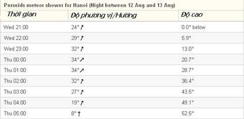 Dưới đây là bảng chỉ dẫn hướng có thể quan sát trực tiếp mưa sao băng Perseids bằng mắt thường ở Hà Nội: