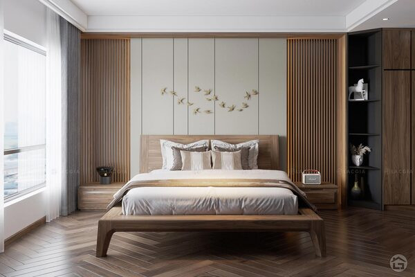 Trong trường hợp có đủ diện tích, bạn có thể căn đều hai bên giường song song với cửa sổ. Bạn cũng nên chuẩn bị rèm cửa hoặc màn che nắng cho cửa sổ khi cần thiết.