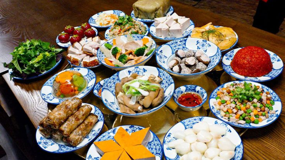 - Mâm cỗ mặn có bánh chưng, rượu, thịt hoặc mâm cỗ chay