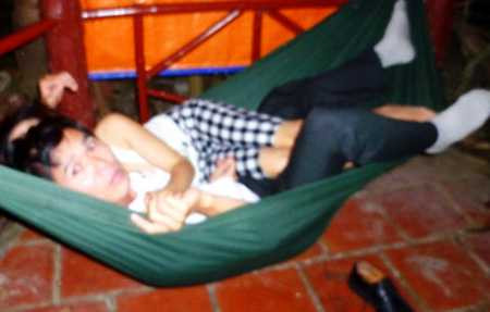 | Thẩm phán Thắng ôm vợ kỹ sư Giàu trên võng (ảnh do người chồng cung cấp) |