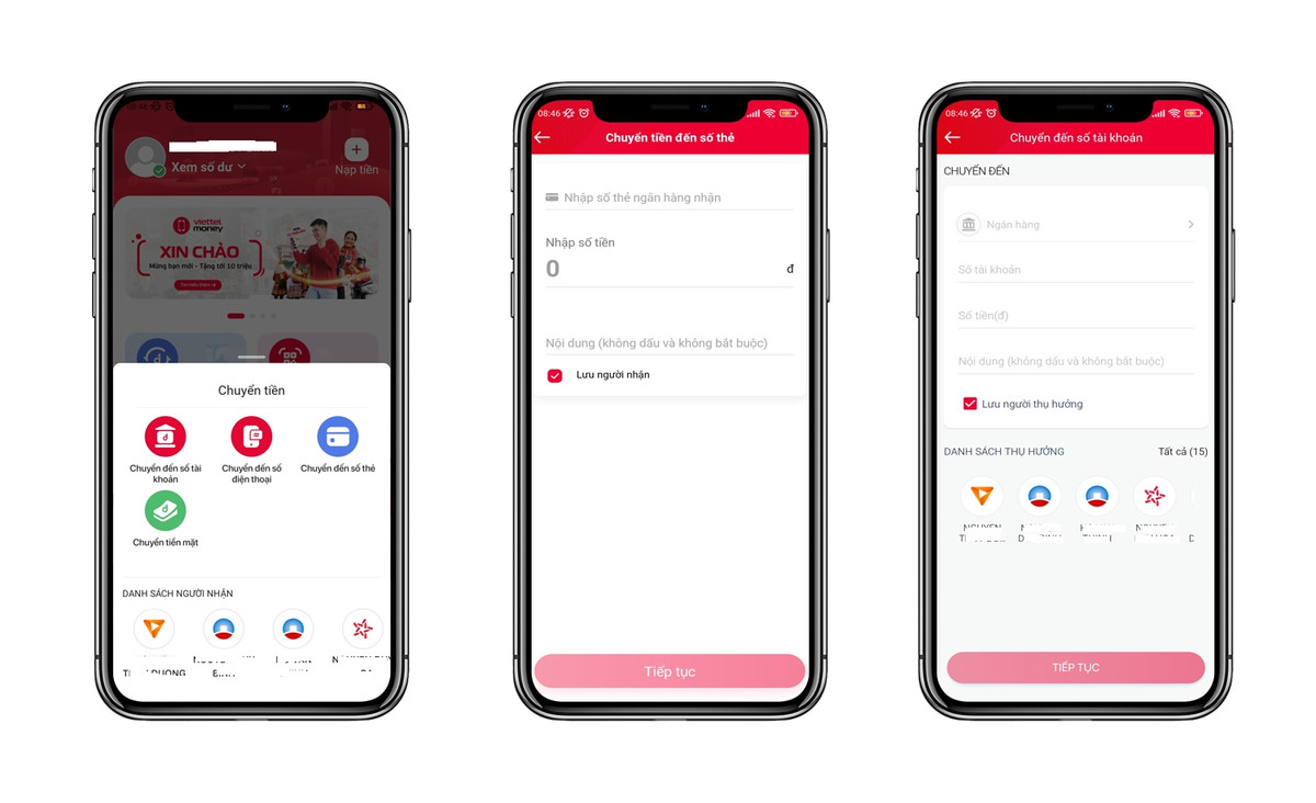 - Bước 3: Chọn "Chuyển tiền tới số tài khoản" và điền thông tin giao dịch bao gồm: ngân hàng nhận, số tài khoản người nhận, số tiền chuyển, nội dung chuyển tiền...