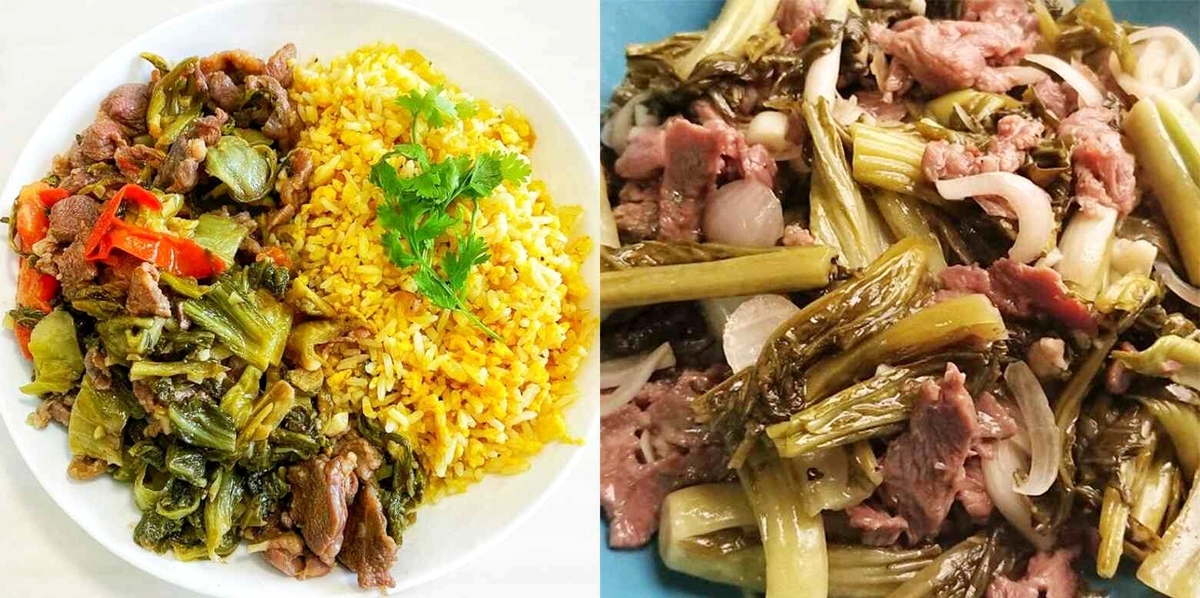 Vẫn dùng chiếc chảo đó, thêm một chút dầu nếu cần, phi thơm tỏi rồi cho dưa chua vào xào. Nêm nếm chút hạt nêm và đường cho dưa đậm đà. Xào đến khi dưa săn lại thì cho thịt bò đã xào vào đảo đều rồi tắt bếp.