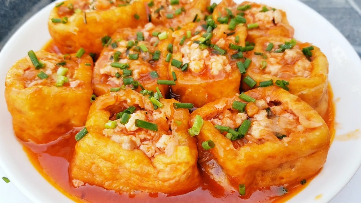 Món đậu hũ nhồi thịt sốt cà chua. (Ảnh: T.H)
