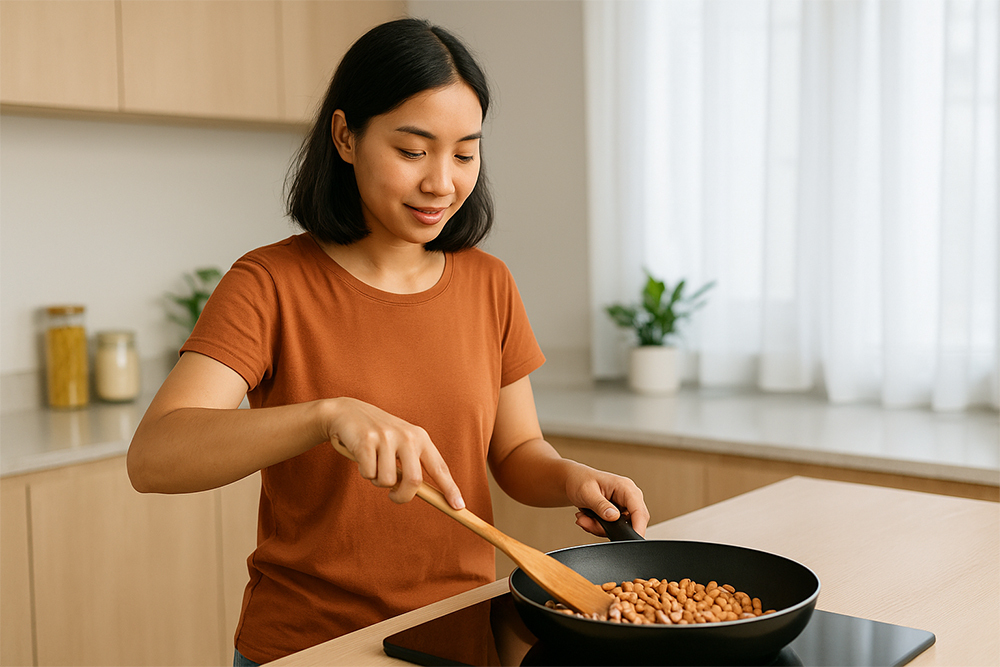 Kiểm tra độ chín: Bốc một vài hạt ra, thổi nguội và bóc vỏ ăn thử. Nếu hạt giòn bùi, không còn cảm giác sống là đạt; tắt bếp, đổ lạc ra rổ inox hoặc khay rộng có lót giấy thấm dầu.