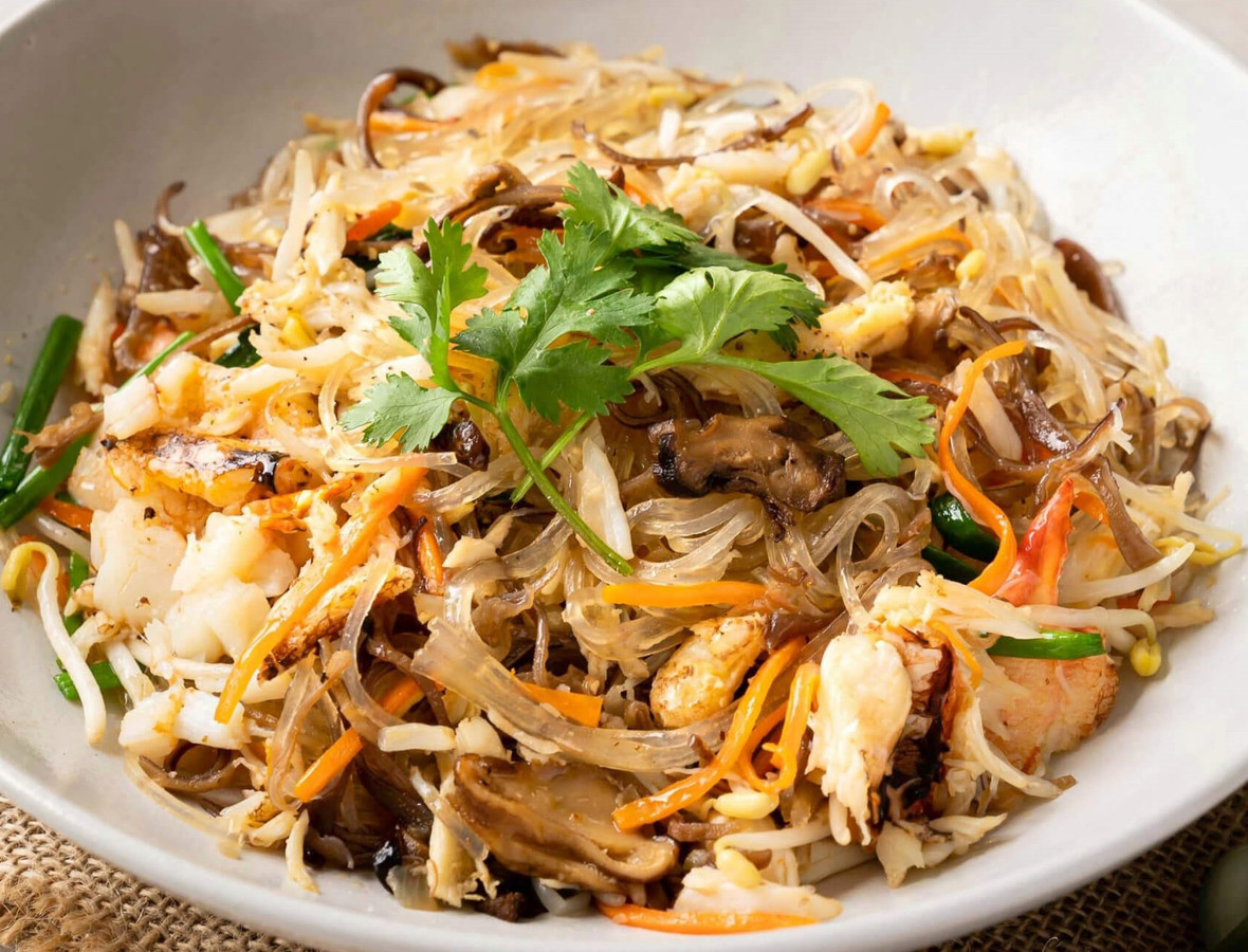Không xào thịt cua quá lâu, dễ khô và mất ngọt. Cho dầu mè và xì dầu vào miến trước khi xào giúp sợi không dính, thơm nhẹ kiểu châu Á.