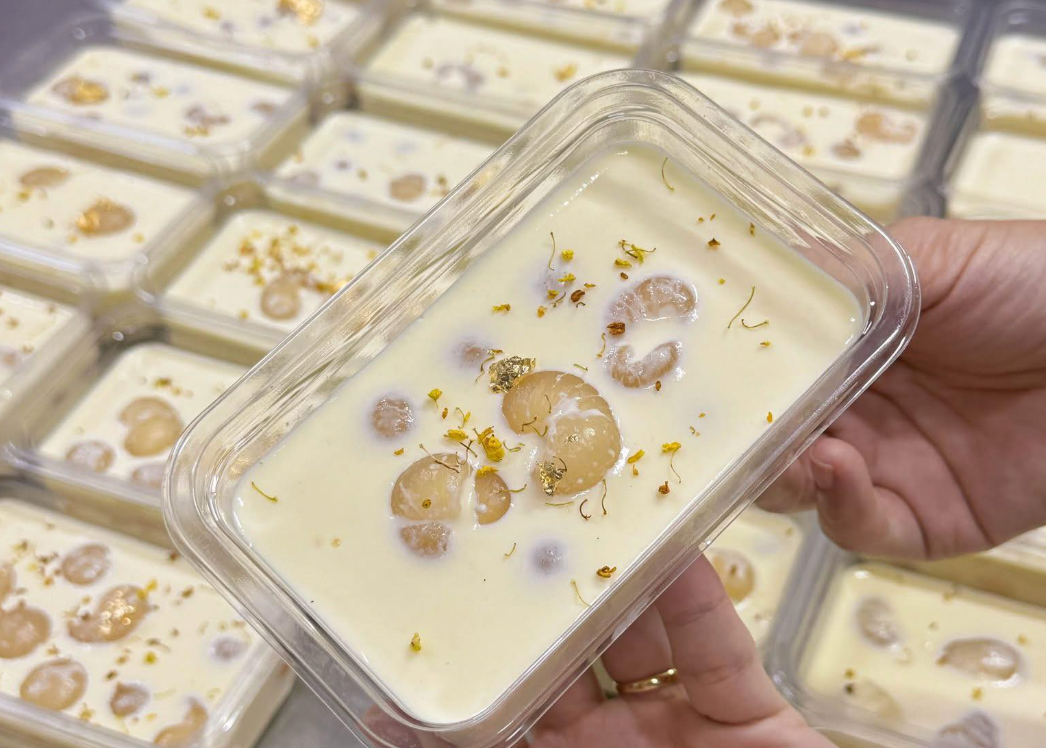 Xếp cùi vải vào hộp và đổ phần kem sữa lên. (Ảnh: Minh Thủy)