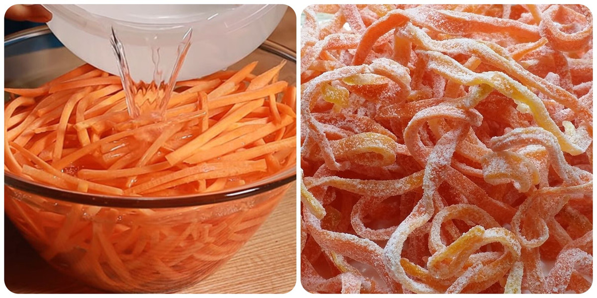 Bước 1: Cà rốt nên chọn những củ to, ngon không sâu. Cà rốt sau khi mua về cần rửa sạch, gọt bỏ vỏ, dùng dao cắt sợi vừa phải (không thái nhỏ quá vì khi ngâm đường, cà rốt sẽ teo nhỏ lại). Đem ngâm với nước muối loãng trong 30 phút để khử bớt mùi hăng.
