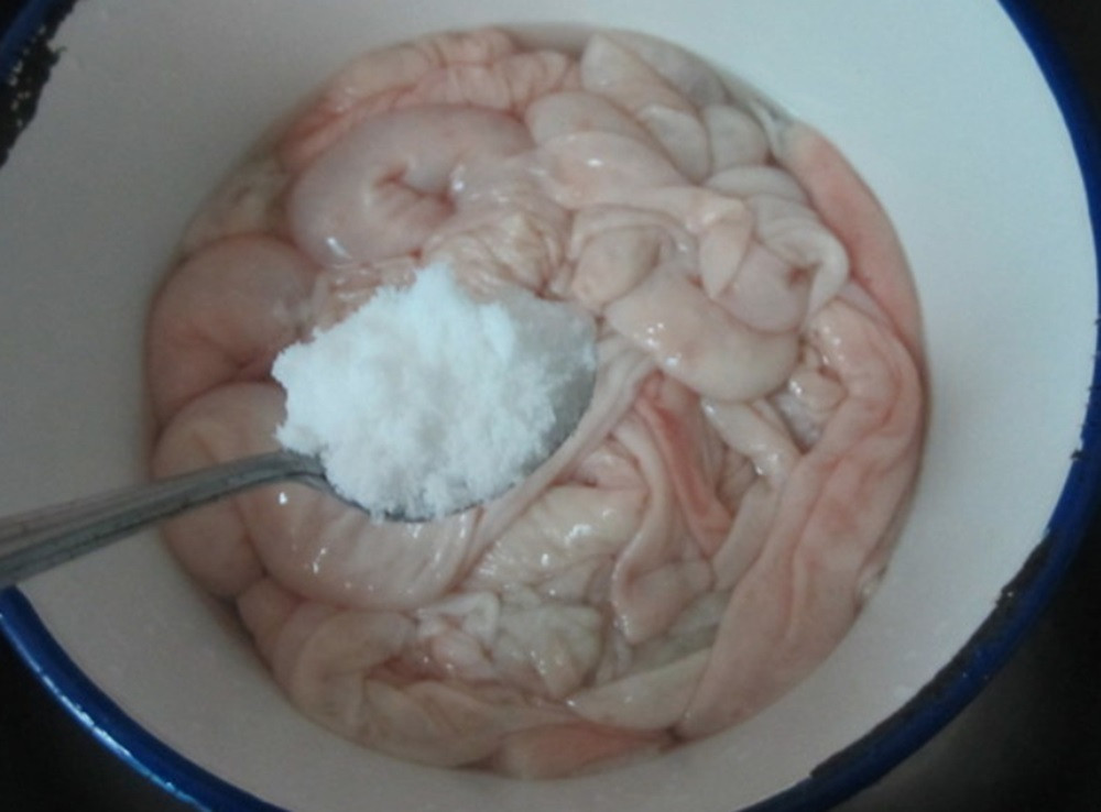 Đây là phương pháp rẻ tiền và hiệu quả để làm sạch lòng lợn. Bạn chỉ cần rửa lòng với nước, sau đó rắc bột baking soda lên bề mặt lòng lợn, bóp nhẹ và để bột baking soda thấm vào bề mặt lòng trong khoảng 15-20 phút. Sau đó, bạn rửa lòng lợn với nước sạch.