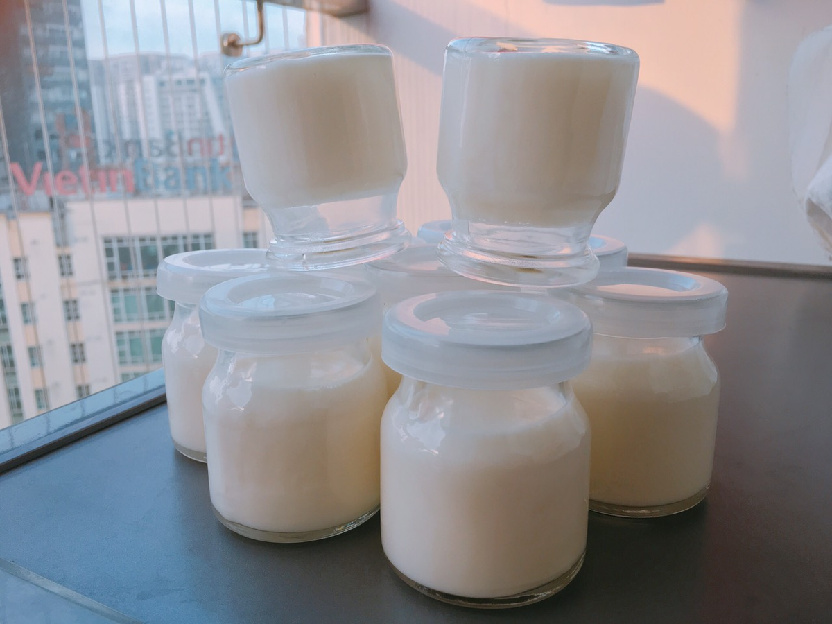 - Sau khi ủ 8 - 10 tiếng, ta được sữa chua thành phẩm. Hũ sữa chua thơm, dẻo, có thể úp ngược mà không bị chảy.
