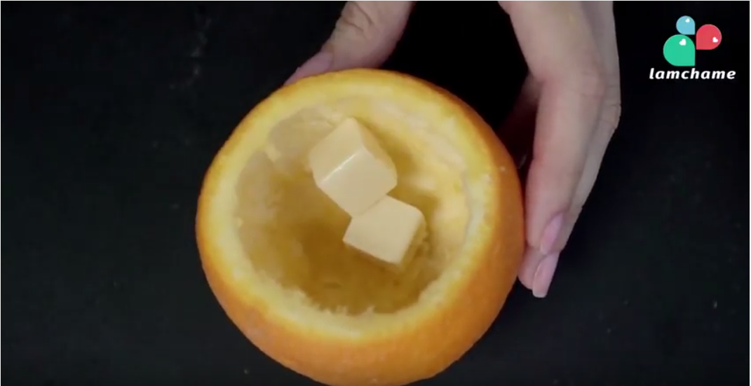 - Phô mai cắt thành 3 viên nhỏ, đặt vào trong vỏ quả cam ban đầu.