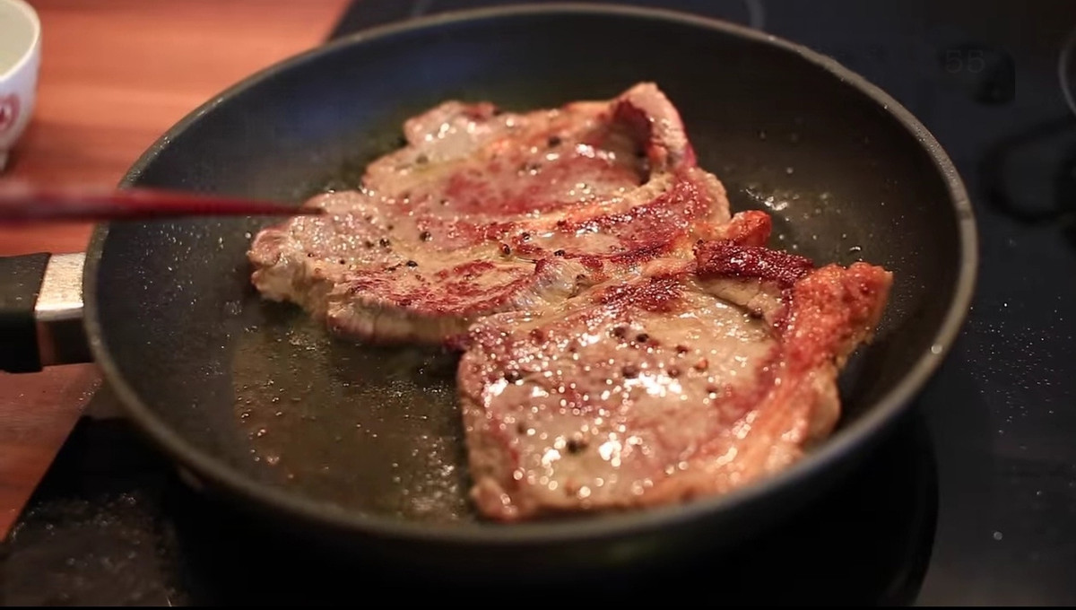 Khi chảo nóng đủ nhiệt, cần điều chỉnh lại nhiệt ở mức vừa rồi cho thịt vào nướng chín trong khoảng 20 phút. Mỗi mặt chỉ nên nướng trong khoảng 10 phút rồi lật mặt và nướng tiếp.