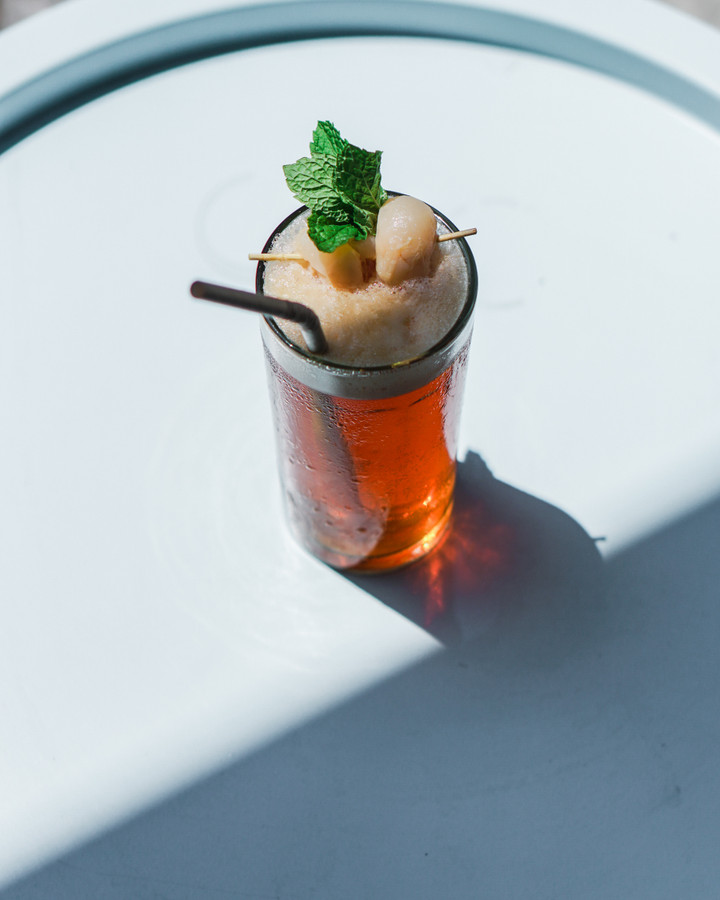 - Rót ra ly, thêm topping vải ngâm, đá viên và tận hưởng thành quả thôi (có thể trang trí một vài nhánh sả cùng lá bạc hà để thức uống được bắt mắt hơn).