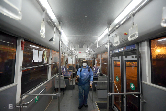162 xe buýt của 15 tuyến trên địa bàn Hà Nội được phun khử khuẩn đêm 5/8. (Ảnh: Sơn Đạt)