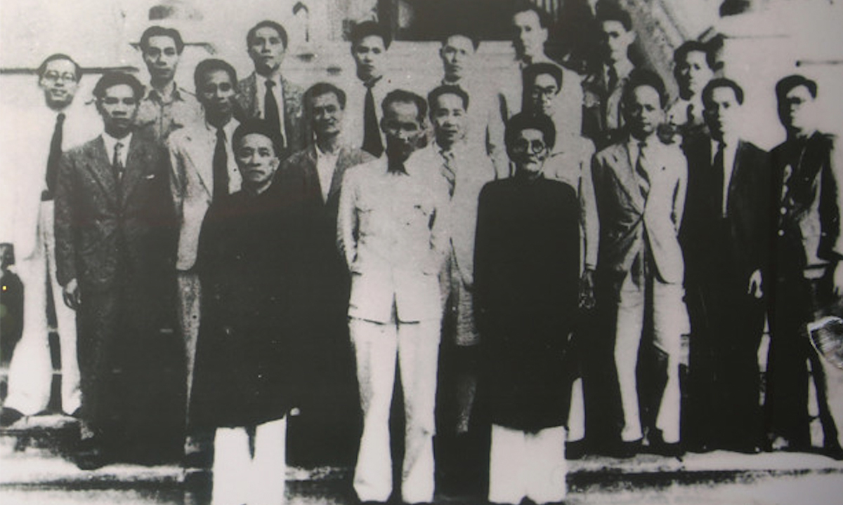 Chính phủ nước Việt Nam Dân chủ Cộng hòa được Quốc hội khóa I bầu ra. Hàng đầu, ở giữa là Chủ tịch Hồ Chí Minh, bên phải là ông Nguyễn Văn Tố, bên trái là ông Huỳnh Thúc Kháng. (Nguồn: Trung tâm Lưu trữ quốc gia III)