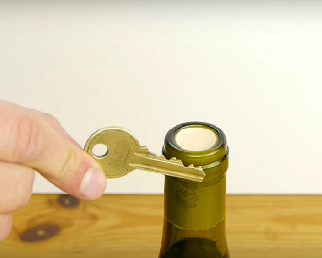 Trong số các cách mở rượu vang không cần dụng cụ thì phương pháp này được đánh giá là đơn giản và phổ biến hàng đầu. Chỉ cần lấy 1 chiếc chìa khóa đủ cứng và dùng lực đâm thủng nút bần của chai rượu ở góc nghiêng 45 độ. Sau đó, xoay chìa khóa và nhấc chiếc nút chai lên phía trên đến khi nó bật ra ngoài.