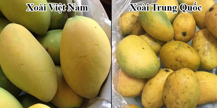 Xoài Việt Nam: Vỏ mỏng, da căng bóng, đều màu, không bị sần sùi, không thâm đen. Xoài có phần cuống vẫn căng tròn.