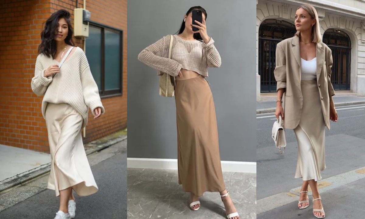 Chân váy lụa là trang phục phù hợp mà các nàng có thể chọn để diện trong cả bốn mùa. Nếu thời tiết nóng, một chiếc áo ba lỗ cùng váy lụa là đủ cho một trang phục năng động.