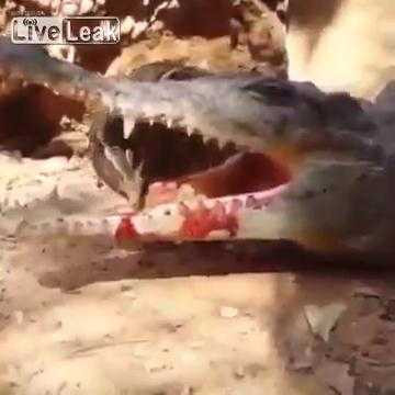 Con cá sấu mở miệng nằm im và chú chim xấu số thò đầu vào làm mồi cho nó.