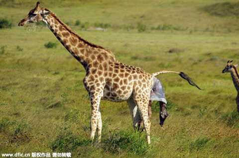 Hình ảnh mới chụp được tại vườn quốc gia ở Nam Phi đã ghi lại chi tiết ca sinh con của hươu cao cổ. Nếu như nhiều loài vật nằm để sinh con thì hươu cao cổ lại đứng sinh. Hươu cao cổ con sẽ từ từ rơi xuống đất khi mẹ sinh ra.