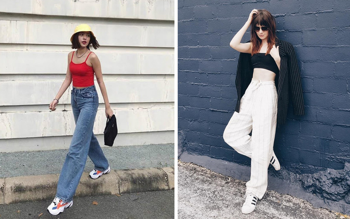Trong concept này, các cô nàng nên lựa chọn quần ống rộng cùng mix với áo croptop và giày thể thao.