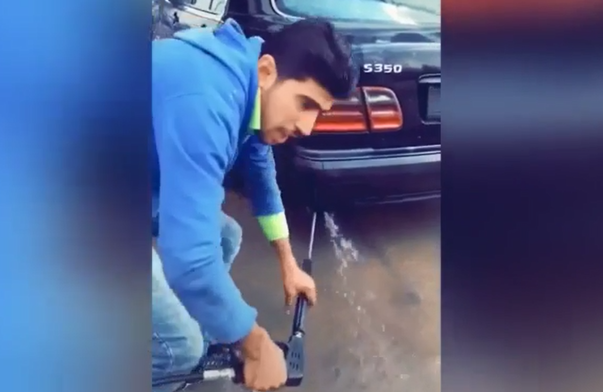 Người đàn ông dùng vòi xịt nước áp lực cao bơm vào ống xả, sau đó đạp ga để đẩy toàn bộ chất bẩn ra ngoài.