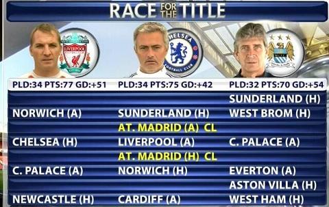 Vòng 37: Chelsea tiếp tục để thua trước Norwich với tỷ số 1-0 sau pha đá phản lưới nhà của Matic và chính thức mất cơ hội vô địch, còn Liverpool-không-Suarez bị cầm hòa 0-0 trước Crystal Palace. Trong khi đó, Man City được đội chủ nhà Everton dâng cho chiến thắng 1-0 với pha đá phản lưới nhà của Baines. Trước trận, các CĐV và cầu thủ đội chủ nhà đồng lòng tuyên bố “sẵn sàng làm tất cả mọi thứ để Liverpool không thể vô địch”. Thầy trò Pellegrini vươn lên đầu bảng với khoảng cách 2 điểm so với Liverpool và 4 điểm với Chelsea.