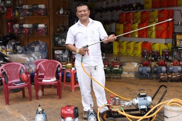 Anh Phạm Thế Minh bên cạnh sản phẩm máy xịt - rửa do anh cải tiến