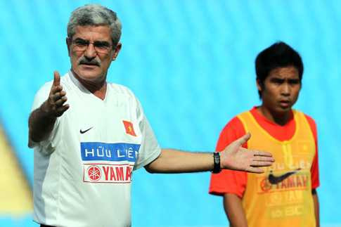 HLV Calisto chỉ đạo Được Em trong một bài tập. (Ảnh: Quang Minh)