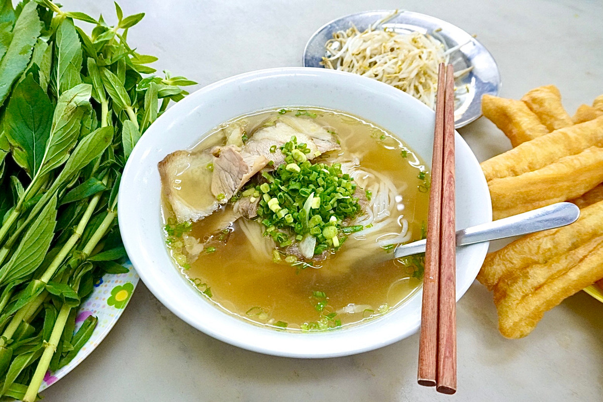 Phở ăn kèm với rau thơm, giá, bánh quẩy.