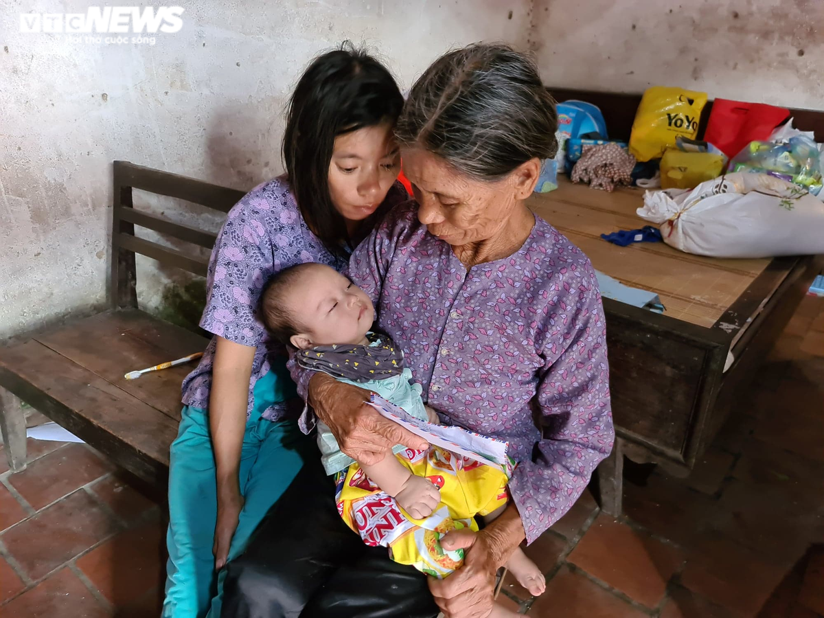 Vừa bế cháu, bà Hảo vừa ngậm ngùi kể, chồng bà mất sớm, một mình bà nuôi 4 người con thì ai cũng bị tật nguyên bẩm sinh, không được khôn ngoan như người bình thường.