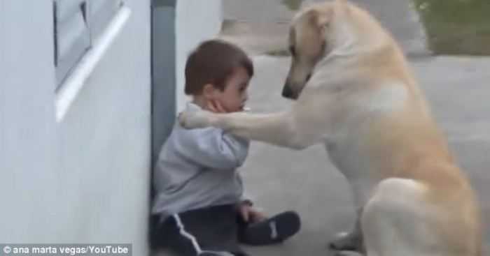 Hình ảnh chú chó hiền nằm xuống đất, đưa hai chân trước về phía em bé, rồi hạ thấp đầu nhìn chăm chú vào cậu chủ nhỏ như ra vẻ an ủi.